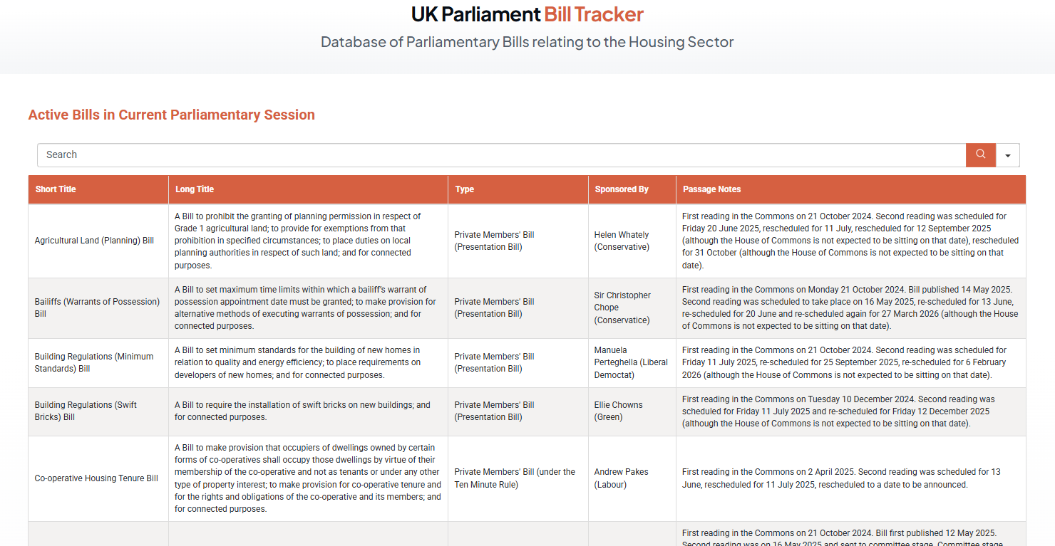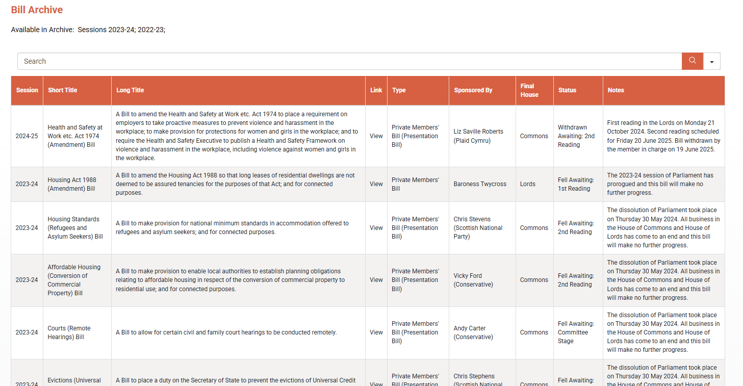A live database providing the long title, short title, type of bill, the sponsor and the passage notes of the current bills.
